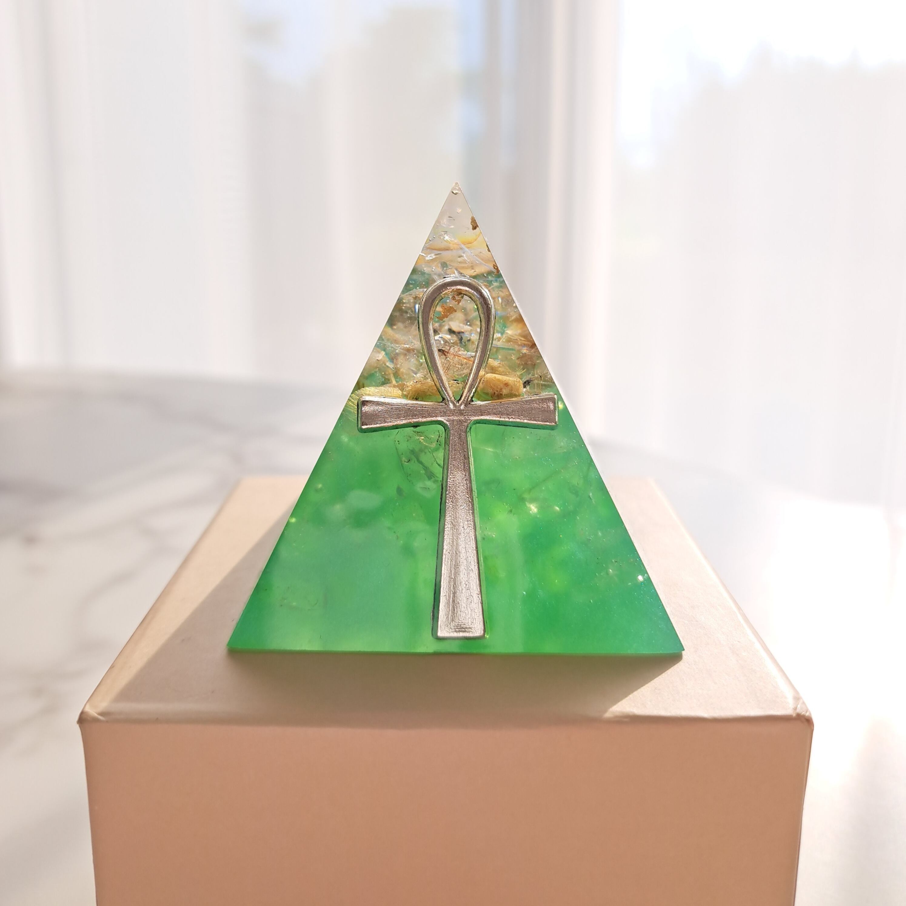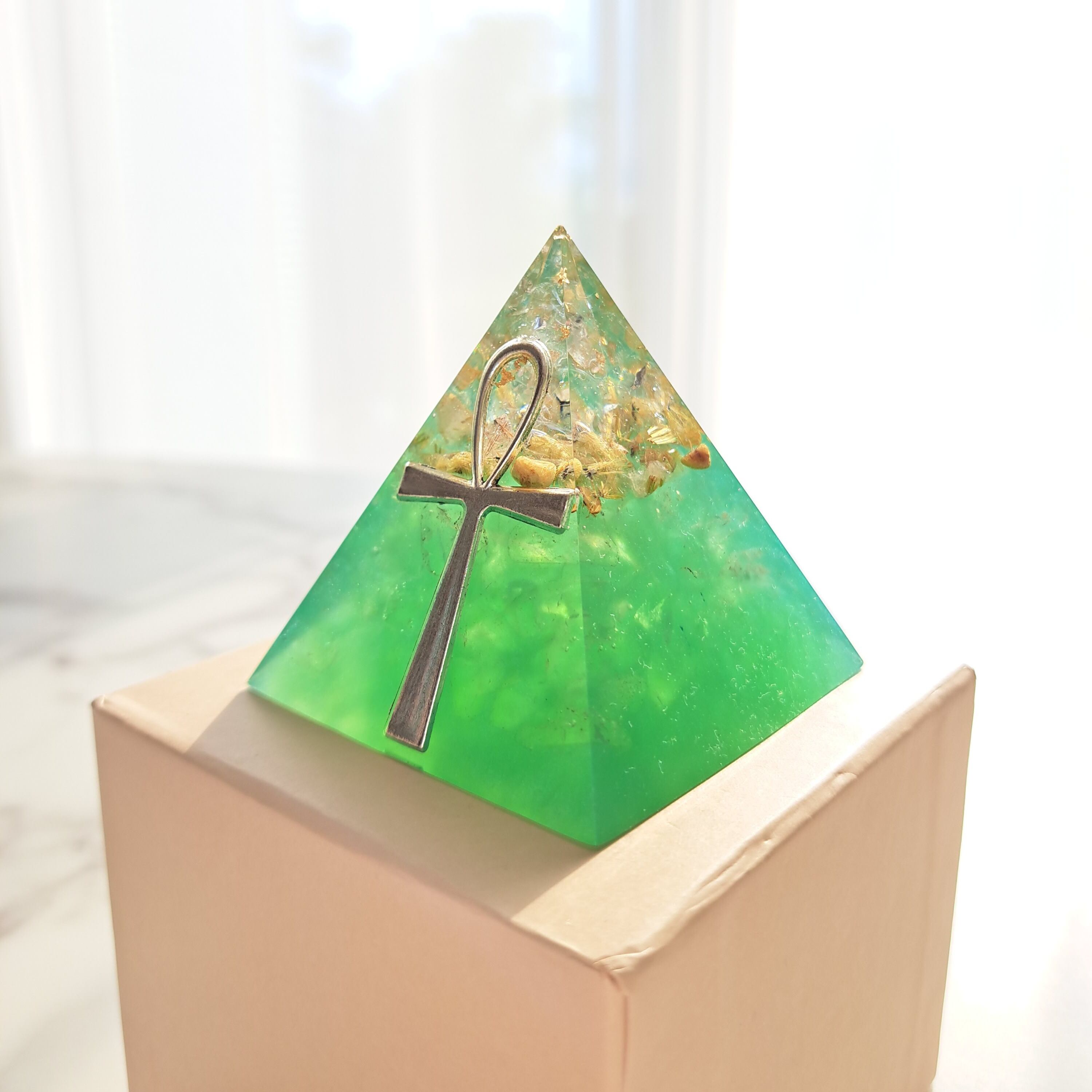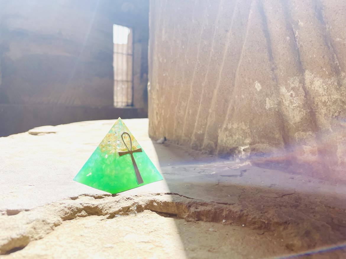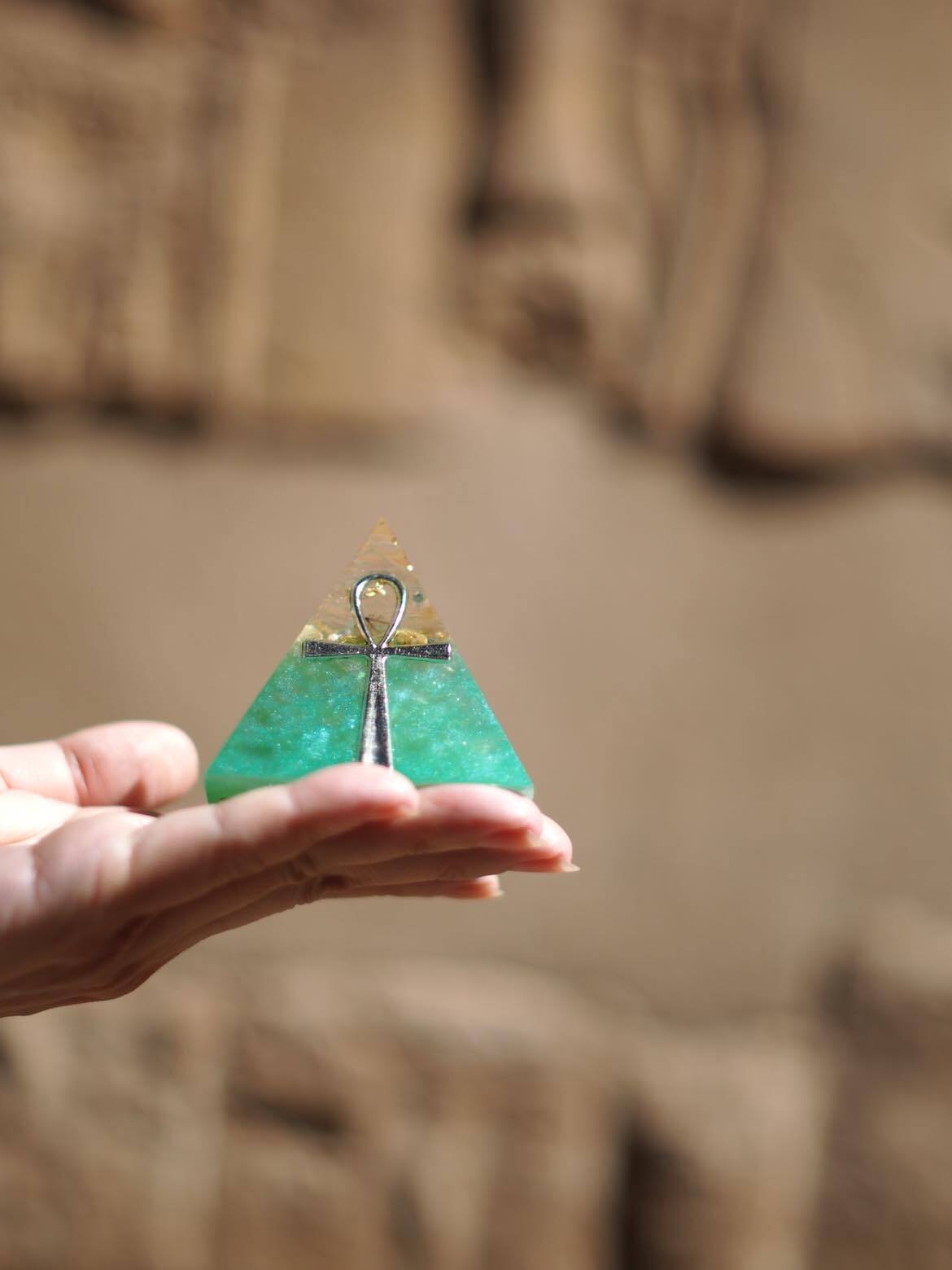 このグリーンのピラミッドは、2022年冬至にエジプトへ行った際、ピラミッド内でセクメト女神がグリーンのマカバのような器のビジョンを見せてくれ、そこからインスピレーションを得て制作しました。