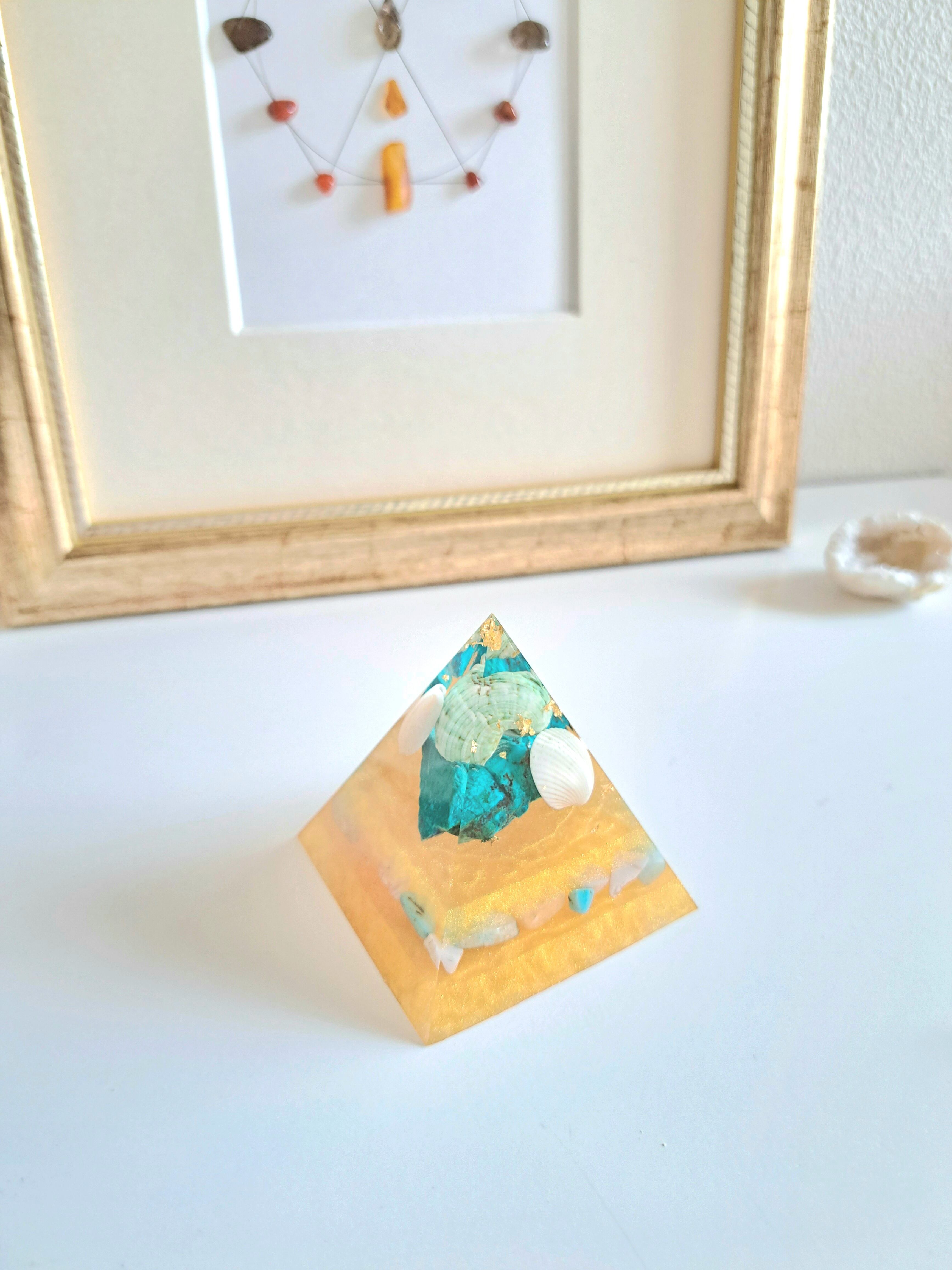 ネガティブなエネルギーを吸収、浄化し、ポジティブなエネルギーに変換する、ピラミッド型の循環装置で、クリスタル・レジン(樹脂)・金属、それぞれが接触、圧力がかかることによって微弱電位が発生。
